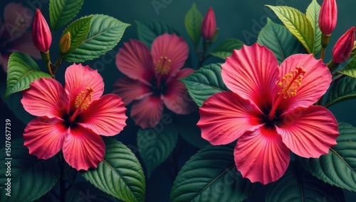 Bold, vibrant hibiscus flowers, lush tropical foliage, continuous repeat, background, leaves, seamless