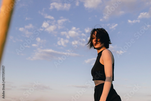 woman, bold, confident, fashion, portrait, sunset, golden hour, natural light, modern, chic, minimalist, casual attire, candid, lifestyle, short hair, expressive, independent, stylish, serene, aesthetic, beauty, urban, open space, relaxed, trendy, artistic, strong, elegant, belarus, one person, female, white