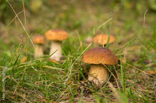 Boletus edulis mushroom. Cep growing in forest.
