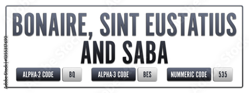 Bonaire Sint Eustatius and Saba. Illustration with ISO 3166-1 Country Code. ISO Alpha-2, Alpha-3 and Numeric code. Two three letters and numbers.