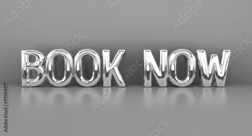 Book now word 3d shiny silver metallic lettering render on plain background