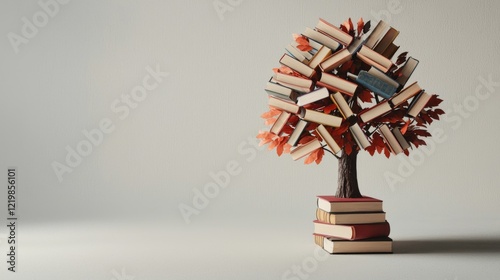 Book Tree 3D Render, Knowledge Growth Concept, Stack of Books, Autumn Leaves, Education knowledge, literature