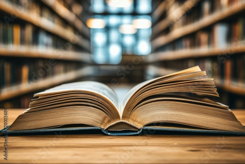 book with open pages, close up, books on the shelf in school, open book on wooden table. back to school concept with generative ai
