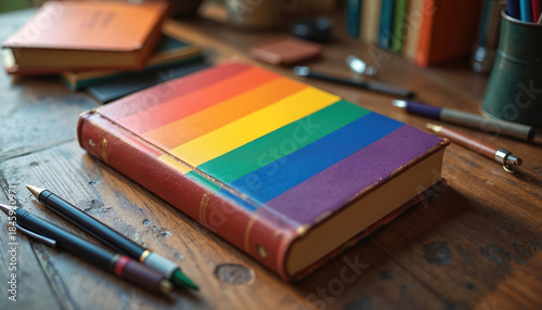 Book with rainbow LGBT flag cover rests on wooden desk. Pens and notebooks surround colorful publication. Celebration of diversity and inclusion in education or personal study.