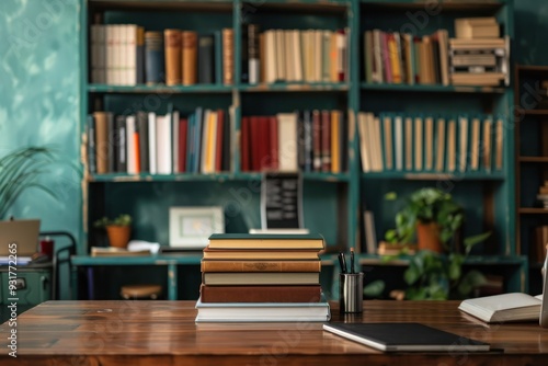 bookshelf, book, desk, stack, table, wood, brown, shelf, literature, reading, library, study, cognition, education, interior, design, home, office, workspace, vintage, organised, order, paper, notebook, laptop, device, background, blurry, green, room, wooden, surface, writing, decoration, plant, shadow, natural, paperback, hardcover, classic, style, old, aesthetic
