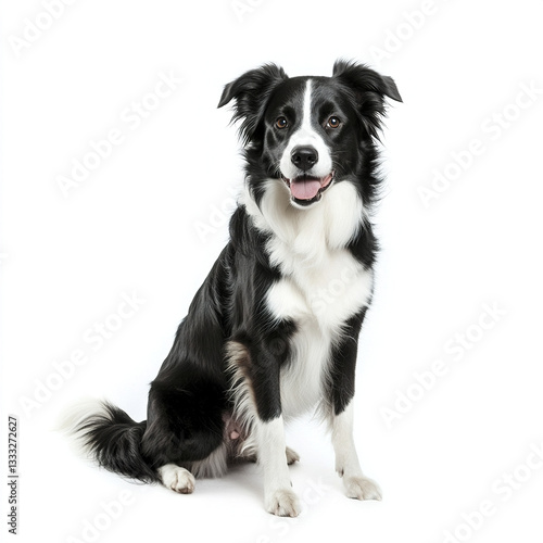 border collie, dog, sitting, white background, happy, black, white, fur, pet, animal, canino, portrait, isolated, full body, alert, friendly, domestic, breed, obedient, intelligent, playful, energetic, loyal, attentive, fluffy, ear, tail, eye