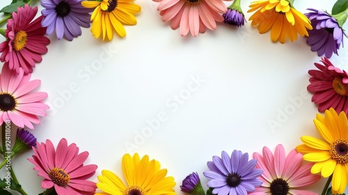 flower, daisy, colourful, frame, border, white background, decoration, floral, spring, summer, bloom, nature, flower petals, bright, fresh, arrangement, beautiful, elegant, graphic, design, invitation, greeting card, celebration, festive, cheerful, vibrant, decorative, isolated, copy space, holiday, seasonal, garden, botanical, flora, ornamental, warm colors, pastel, pink, yellow, purple, composition, white space, creative, illustration, layout