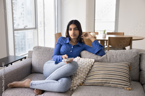 indian, person, woman, female, girl, young, adult, beautiful, pretty, home, house, hold, room, flat, couch, sofa, furniture, rest, relax, using, remote, control, television, television, cyberspace, smart, online, technology, communication, motion picture, interior, leisure, entertainment, enjoy, streaming, cinema, series, broadcast, serious, calm, bored, lazy, pensive, thoughtful, comfortable, comfort, cosy, living, soft, relaxation
