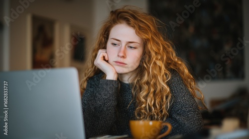 Bored young woman with curly hair studying online at laptop, tired female student or remote worker feeling fatigue and lack of motivation at home