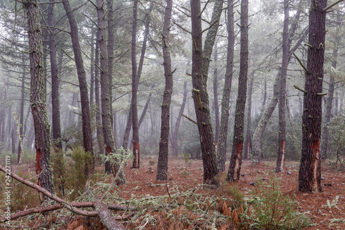 Bosque de pino negral en invierno con aprovechamiento de resina. Pinus pinaster.
