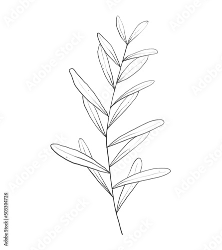 Botanic outline floral branch, leaves. Hand drawn floral abstract pencil sketch plant isolated on white background line art illustration