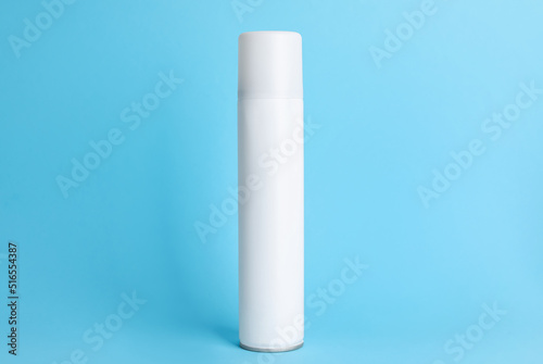 Bottle of dry shampoo on light blue background