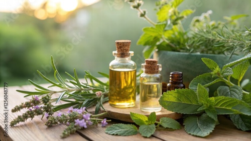 Bottle of essential oil beside fresh herbs on a wooden surface for natural wellness and aromatherapy