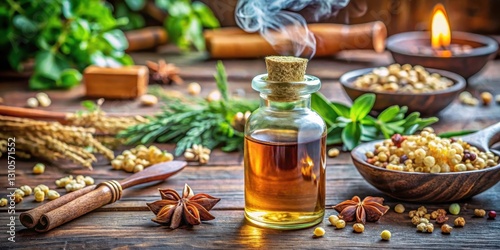 Bottle of frankincense essential oil on wooden table, aromatic herbs and spices, incense, natural, incense, natural