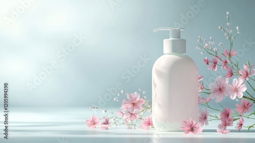 Bottle of liquid with pink flowers on a blue background for decorative and artistic purposes