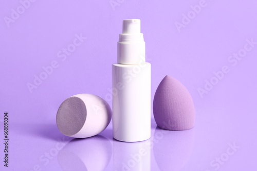 bottle, foundation, make-up, purple, sponge, accessory, apply, artist, background, footed, beauty, beige, care, colours, cosmetic, cosmetic, cream, decorative, design, different, face, facial, fashion, glamour, item, constructed, make-up, natural, nobody, object, product, professional, skin, style, substance, tint, tone, trend, up, visage