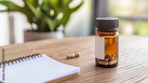 Bottled Capsules on Wooden Surface with Notepad and Green Plant