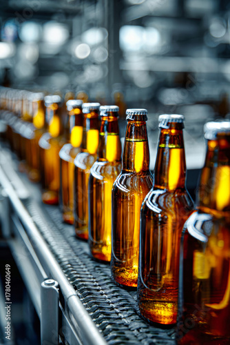 Bottles of beer lined up on a conveyor belt in a brewing facility during production