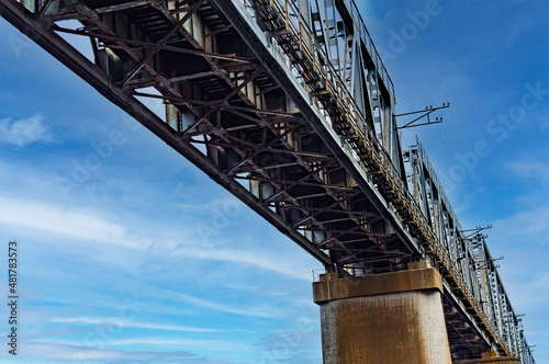 Bottom view of the railway bridge against the blue sky. Railroad bridge. Iranport crossing. Industrial design. Blue sky with white clouds. Railroad tracks. Iron structure on concrete supports.