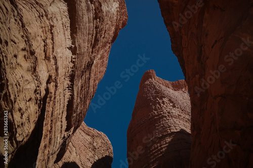 Bottom-up view to Abstract Rock formation at plateau Ennedi aka stone forest in Chad