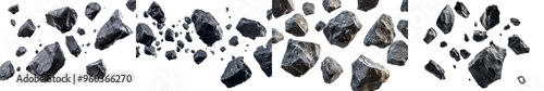 Boulders or stone meteorites swarming in space, isolated on transparent background.