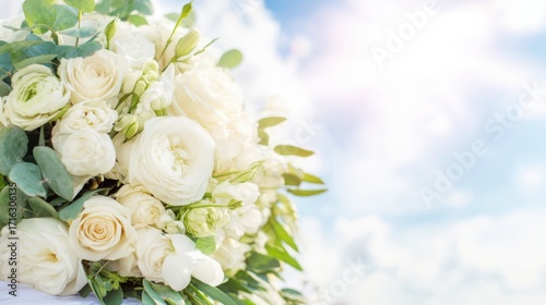 bouquet. Dreamy white rose bouquet softly focused against a blue sky, evoking serenity and natural beauty. gardening catalogs, home-decor guides, designed for home decor and floral branding.