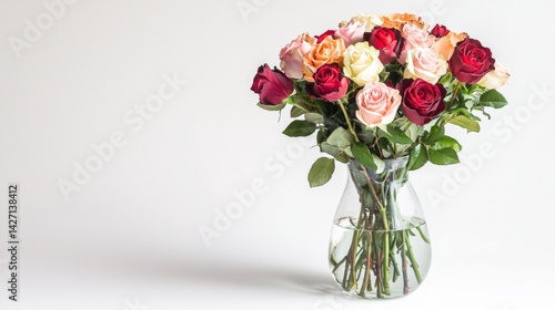 Bouquet of assorted roses in a clear vase on a simple background showcasing vibrant colors and floral beauty