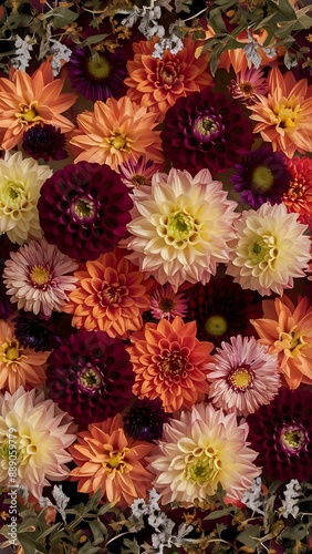 Bouquet of bright autumn flowers festive border cut dahlias asters sprigs of viburnum top view