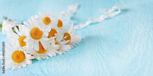 daisy, background, flower, summer, blue, bouquet, nature, white, beautiful, plant, simple, wooden, spring, yellow, fresh, blossom, flat, lay, beauty, green, chamomile, floral, wood, decoration, closeup, object, table, single, detail, garden, flora, bloom, still, design, minimalism, simplicity, creative, aroma, gentle, fragility, view, top, banner, panorama, organic, copy space, bright