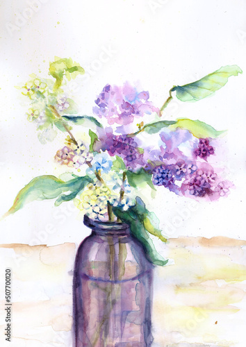 Bouquet of lilac flowers in a transparent vase. Hand drawn watercolor illustration