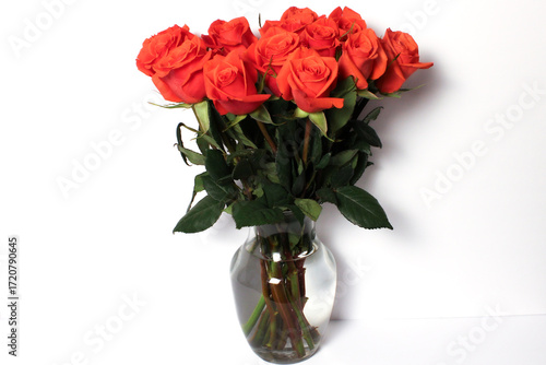 Bouquet of Orange Roses in Glass Vase on White Background