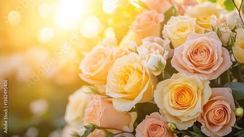 Bouquet of peach roses, sunlight, blurred background, floral display, beautiful arrangement, perfect for romantic events, wedding or celebrations, stock photo