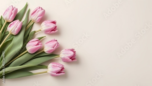 bouquet of pink tulip flowers, flower frame on ivory background, Greeting floral card template with copy space, Summer Background, Birthday, Valentine’s Day, Flat lay, top view, space for text