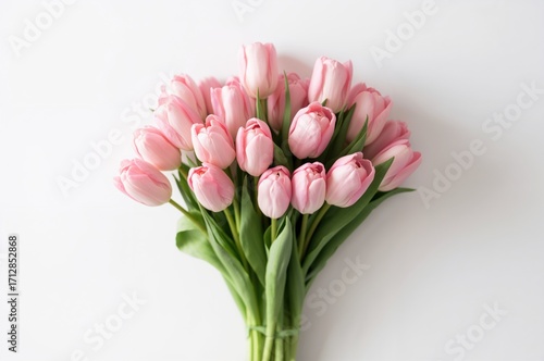 Bouquet of pink tulips arranged on a white surface, viewed from above