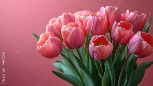 Bouquet of pink tulips flowers on pastel pink background.