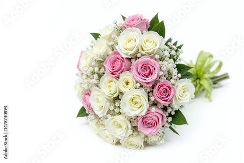 bouquet of white and pink flowers with a green ribbon