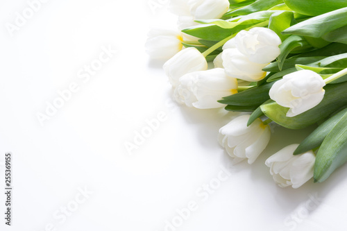Bouquet of white tulip on white. Floral pattern. Space for text.