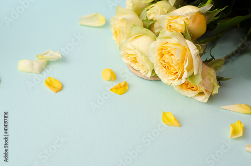 bouquet of yellow roses with petals on a light blue background. Festive floral background. Space for text