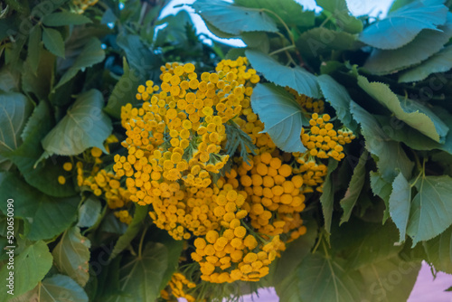 Bouquet of yellow tansy in green leaves