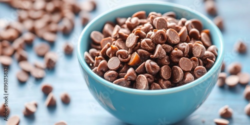 Bowl filled with chocolate chip breakfast cereals on a blue wooden surface with scattered cereal pieces in the background, warm brown tones dominate.