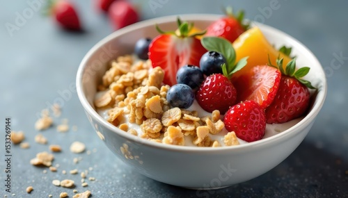 Bowl filled with yoghurt and granola topped with fresh fruit and nuts , nutrition, nuts, breakfast