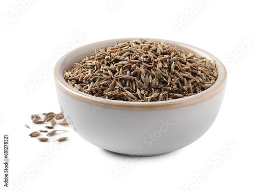 Bowl of aromatic caraway (Persian cumin) seeds isolated on white