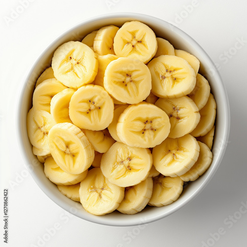 bowl of banana slices, top view, white background