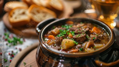Bowl of Beef Stew With Bread and Parsley