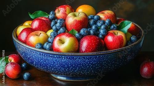 Bowl of colorful fruits. Fresh apples, plums, and blueberries in a blue bowl