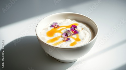 bowl, dessert, creamy, honey, flower, purple, food, white, background, shadow, light, sunlight, texture, delicious, sweet, dish, floral, arrangement, simple, elegant, presentation, culinary, epicure, treat, table, still, life, minimalist, aesthetic, nourishment, diet, organic, natural, healthy, eating, style, fresh, ingredient, violet