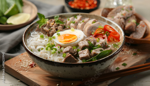 Bowl of delicious rice noodle soup with meat and egg on wooden board, closeup