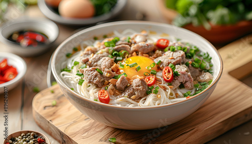 Bowl of delicious rice noodle soup with meat and egg on wooden board, closeup