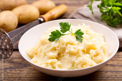 mashed, potato, bowl, mash, food, creamy, vegetable, closeup, vegetarian, dish, cooked, white, healthy, yellow, prepared, background, fresh, green, spoon, table, nobody, meal, wooden, ingredient, herb, rustic, napkin, object, parsley, still life