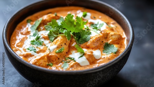 curry, bowl, food, cream, herb, orange, dish, meal, cookery, sauce, cilantro, garnish, indian, asian, spicey, delicious, tasty, cooked, dinner, lunch, eatery, serving, plate, dark, surface, closeup, creamy, savoury, aromatic, flavorful, fresh, healthy, ingredient, nourishment, preparation